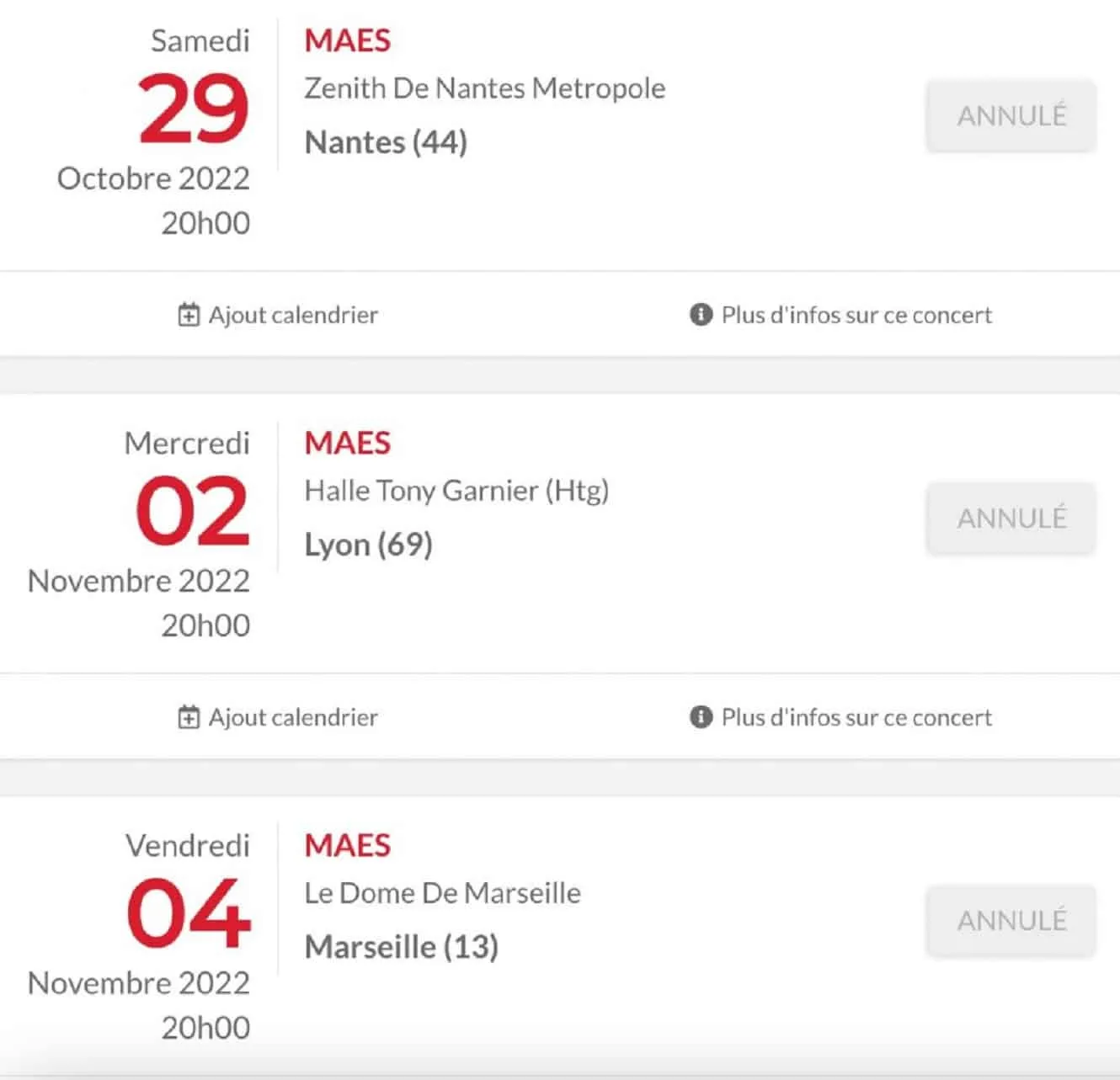 Vient d’être annoncée l’annulation de la totalité des dates de la tournée de Maes, initialement prévue pour fin 2022.